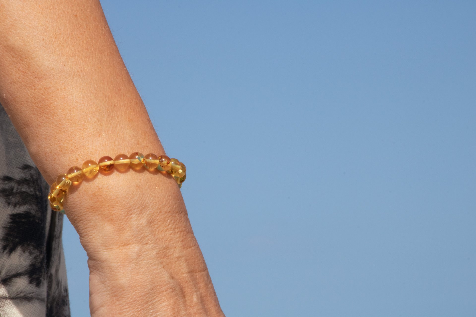 Bracelet Ambre claire ; L’ Ambre est une résine provenant de certaines espèces d’arbres datant de 25 à 40 millions d’années. Cette résine a connu un processus de fossilisation la rendant suffisamment dure.