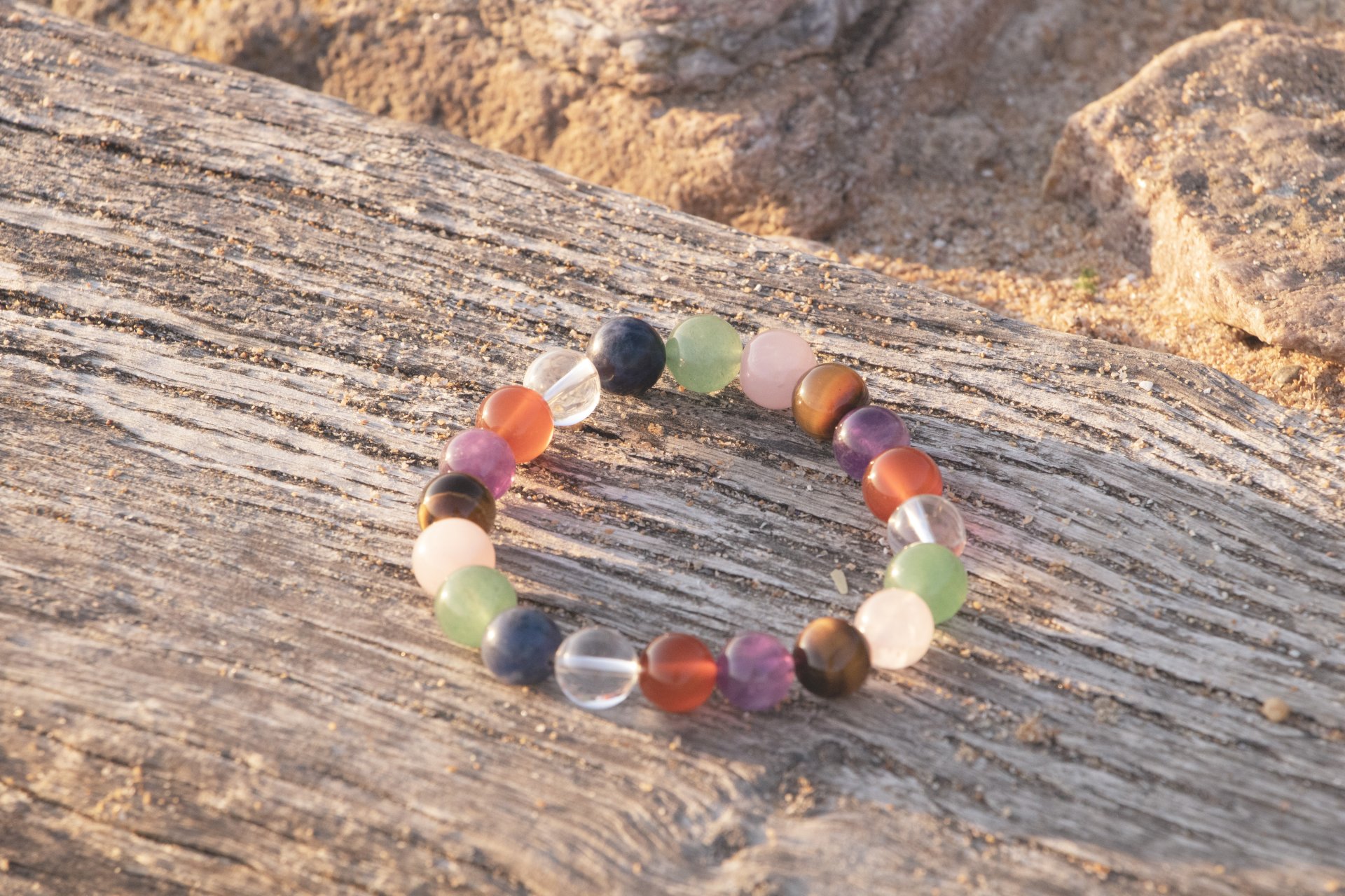 Bracelet mixte en 7 chakras en pierre naturelle : œil-de-tigre, améthyste, cristal de roche, dumortiérite bleu, aventurine, cornaline