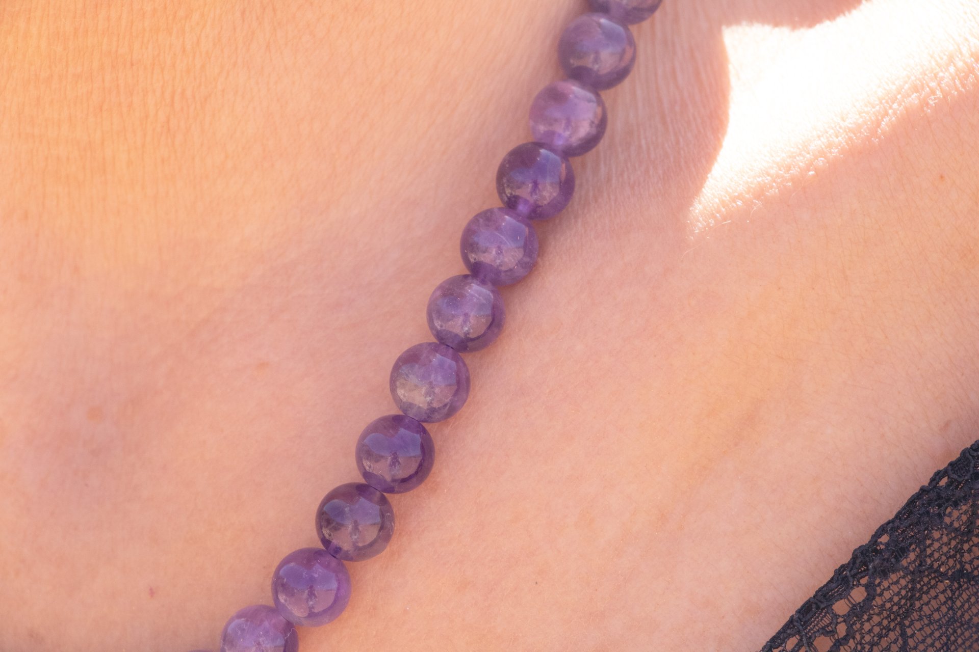 L’Améthyste est un quartz de couleur violet, l’Améthyste développe l’intuition. L’Améthyste apporte une puissante protection, il calme la nervosité, il apaise les angoisses, les colères, le sommeil devient plus paisible. Permet à la personne qui le porte de retrouver une paix intérieure. Ce bracelet renforce l’amour grâce à sa vibration violette.